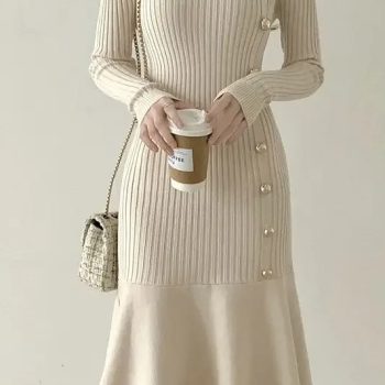 Fleepmart Elegant Knitted Fishtail Dress for Women Autumn Winter White Black O-neck High Waist Slim Chic Party Solid Button Dresses