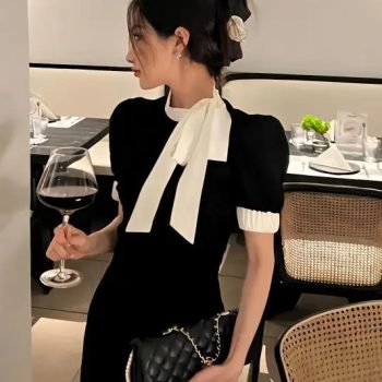 Fleepmart Vintage Slim Black Mini Office Summer Sexy Bodycon Elegant Casual Short Sleeve Woman Dress