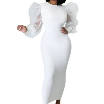 Fleepmart Four-season Sexy Bodycon Dress White Mesh Transparent Lantern Sleeve Bodycon Skirt Fashionable Trendy Women’s Wear