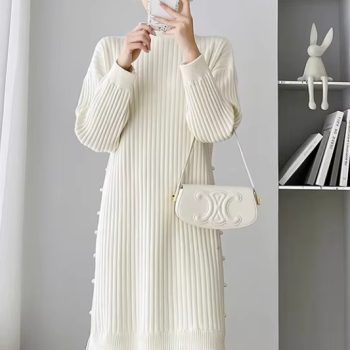 Fleepmart Autumn New Casual Straight Loose Knitted Ribbed Dress For Women Long Sleeve Elegant Beading Midi Wool Jersey Dress