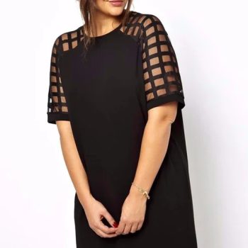 Fleepmart Plus Size Loose Summer Elegant Straight Dress Women Cell Print Short Mesh Sleeve Casual Tunic Dress Large Size Black Tee Dress