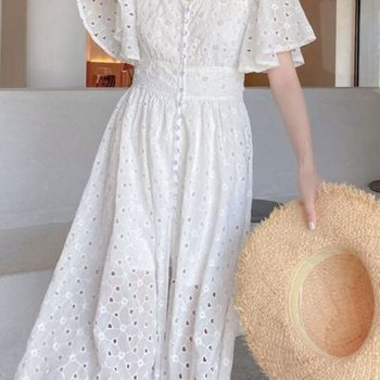 Fleepmart Women Holiday Style Embroidery Hollow Out High Waist Dress Square Collar Temperament Spring Summer 2024