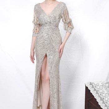 Fleepmart Split V neck Long sleeve Cocktail Party Dress Women’s Sexy Sequins Robe Floor length Shinning Formal Vestidoes Simple Full Dress