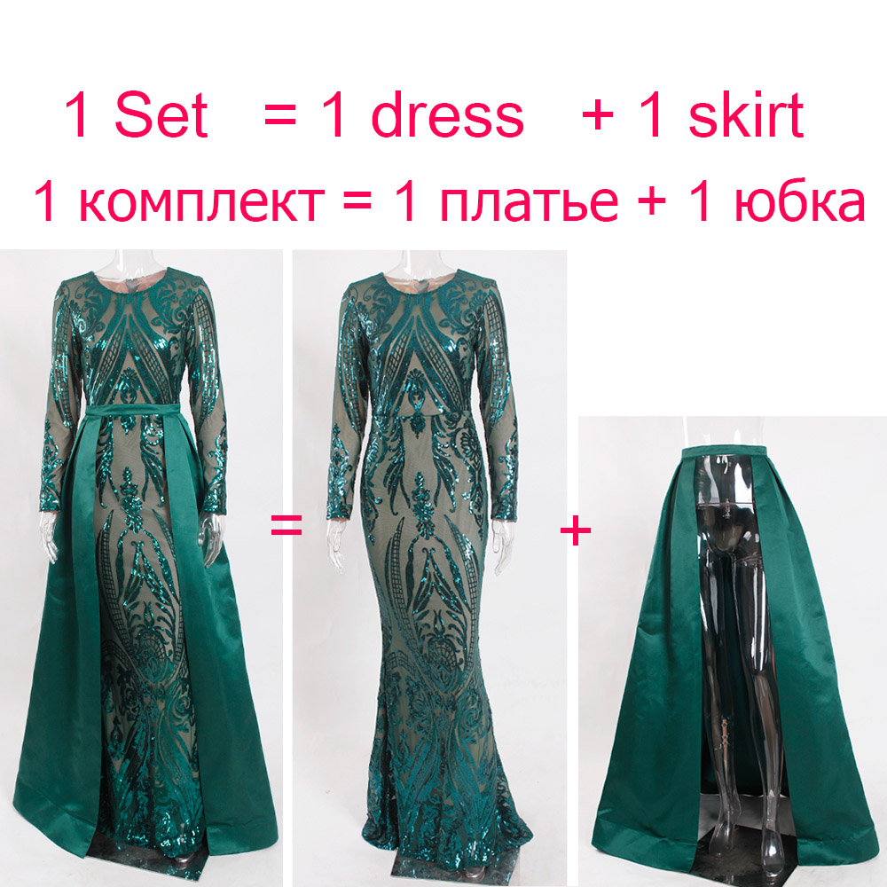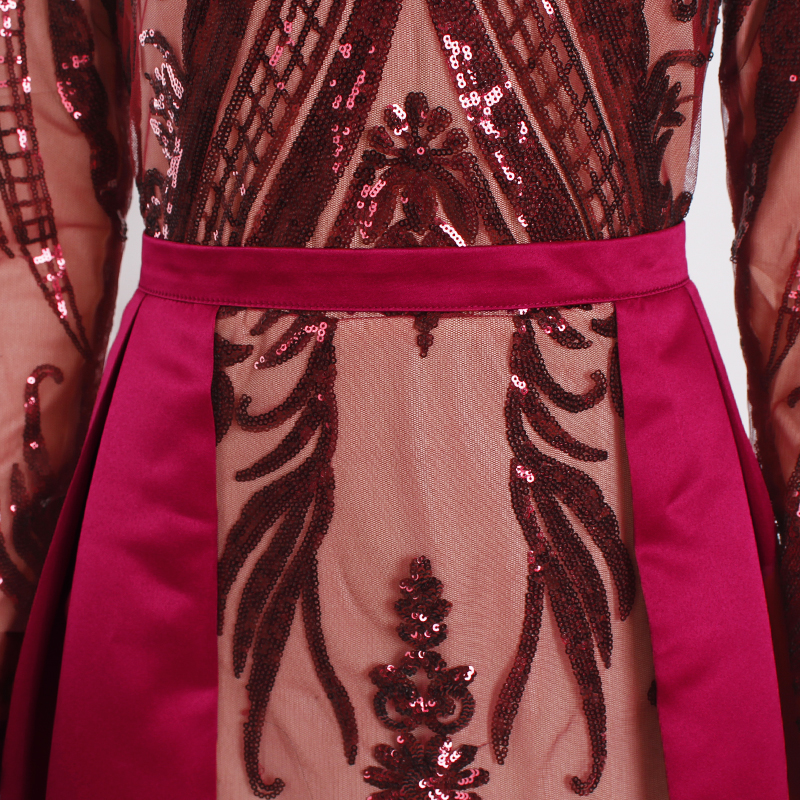 fleepmart 2021 Green Sequined O Neck Full Sleeved Evening Party Dress Stretchy Floor Length Ball Gown with Detachable Train Burgundy