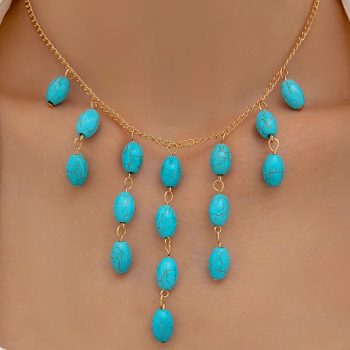 Fleepmart Vintage Ellipses Green Stone Layered Pendant Necklace for Women Ethnic Style Alloy Metal Ajustable Jewelry Party Collar