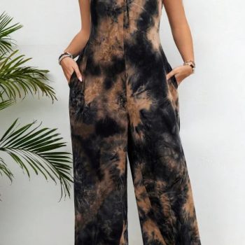 Fleepmart Jumpsuits Women Print Round Neck Sleeveless Casual Loose Overalls Wide Leg Long Pants Lace Up Rompers