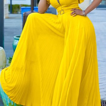Fleepmart Women Wide Leg Jumpsuits Pleated High Waist V Neck Ruffles African Female One Piece Rompers Elegant Summer Fashion Yellow 2023