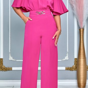 Fleepmart Pleated Maxi Jumpsuits Short Fly Sleeve Deep V Neck Fold Wide Leg Playsuits Women Trousers Office Summer Party Evening Overall