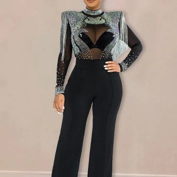 Fleepmart Sexy Jumpsuits 2022 New Arrivals Women Transparent Diamond Tassel High Waisted Elegant Evening Night Party Club Rompers Jumpsuit