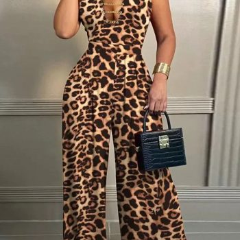 Fleepmart Leopard Print Chain Strap Plunge Jumpsuit Women Summer Sleeveless V Neck High Waist Playsuits Jumpsuit Pants