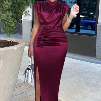 Fleepmart Women Dress Pleated Long Wine Red Elegant Slit High Collar Slim Fit Sleeveless Maxi Robes Female Shiny Gowns Party 2022 Spring