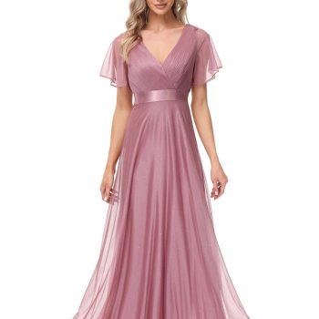 Fleepmart Shinning Wedding Party Dress Purpul Pink Lotus Leaf Short Sleeve Long Evening Dress V-neck A-line Prom Gowns Formal Robe
