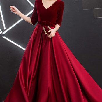 Fleepmart V-neck Bow Waist A-line Satin Evening Dresses Short-Sleeve Velour Formal Women Prom Dresses Elegant Graduation Party Gowns