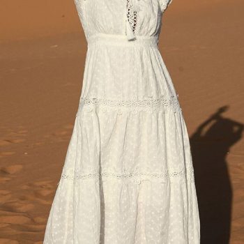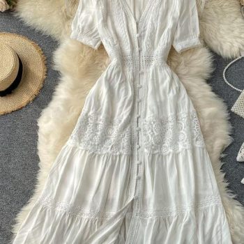 Fleepmart 2022 Summer Vocation Women Long Beach Dress Embroidery Vintage Short Sleeve White Lace Cotton Maxi Dresses