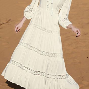 Fleepmart Summer Vocation Women Maxi Beach Dress Long Sleeve Vintage White Lace Crochet Long Party Dress