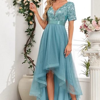 Fleepmart New Women V-Neck Irregular Hem Blue Formal Evening Dress A-line Sequin Tulle Birthday Party Dress