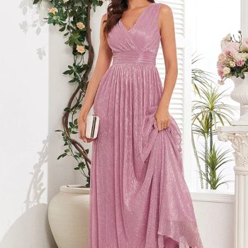 Fleepmart 2024 New Women Pink Pressed Pleat Evening Dresses V-Neck A-Line Sleeveless Birthday Party Long Dress