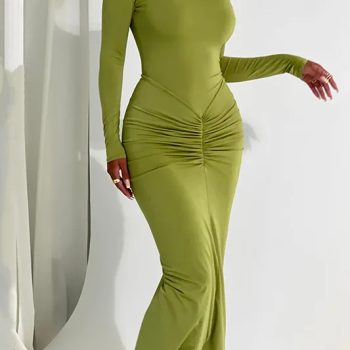 Fleepmart Long Sleeve Ruched Bodycon Dress Women Turtleneck Bandage Long Dresses Autumn Black Skinny Stretchy Party Vestidos