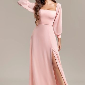 Fleepmart Women Strapless Pink Long Sleeved Bridesmaid Dresses Chiffon Free Wear Square Neck Party Gown Elegant Party Dress For Wedding