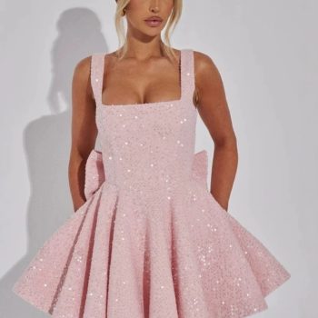 Fleepmart Sexy Sling Square Neck Bow Design Mini Women Pink White Sequins A-line Elegant Evening Cocktail Club