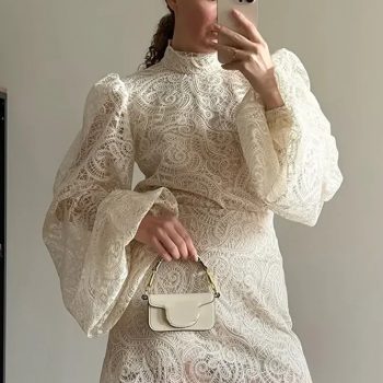 Fleepmart Lady Elegant Hollow Out Lace Short Dresses Trendy Long Sleeve High Neck Mini Vestidos 2025 New Chic Autumn Night Club Gown