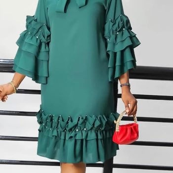 Fleepmart Women Shirt Dress Loose 4 3 Sleeves Pleated Ruffles Bow Collar Elegant Ladies African Spring Summer Office Work Wear Church Gown
