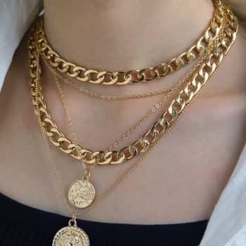 fleepmart Punk Vintage Layered Portrait Coin Pendan Necklace Set Chunky Thick Cuban Link Chains Choker Necklaces For Women Jewlery