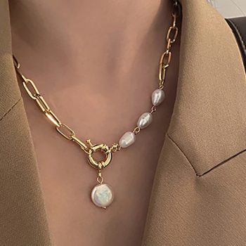 Fleepmart Irregular Natural Freshwater Pearl Pendant Necklaces for Women Chunky Chain Circles Baroque Pearl Necklaces Elegant