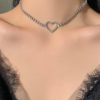Fleepmart Fashion Bling Crystal Heart Choker Necklace for Women Girl Silver Color Simple Short Chain Necklace Party Wedding Jewelry
