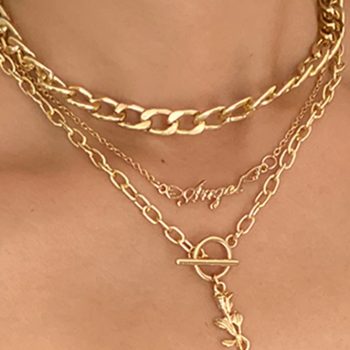 Fleepmart Vintage Rose Flower Thick Chain Pendant Necklace for Women Fashion Letter Flower OT Buckle Multilayer Necklace Jewelry Gift