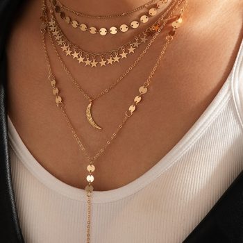 Fleepmart -bohemian-gold-wafer-moon-pendant-neckalce-for-women-charms-multi-layer-long-chian-alloy-metal-adjustable-jewelry-