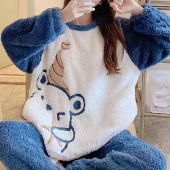 Fleepmart Thickened Warm Women’s Sleepwear Coral Velvet Pajamas Loungewear Winter Cartoon Bear Padded Girl Nightwear