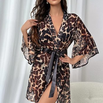 Fleepmart Leopard Kimono Belt Bath Robe Bridesmaid Wedding Party Long Sleeve Lingerie Sexy Nightwear Nesh Women’s Sleepwear