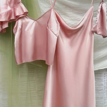 Fleepmart 4 Pieces Casual Comfortable Solid Satin Sleepwear Simple Vocation V Neck Slip Dress Cami Top Shorts Women’s Pajamas Sets