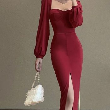 Fleepmart Elegant Solid Color Long Prom Dresses for Women Square Collar Puff Sleeve Sexy Bodycon Slit Evening Cocktail Party Gowns Clothes