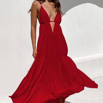 Fleepmart Boho V Neck Red Cami Long Dress Backless Summer Sexy Party Plus Size Bohemian Beach Fashion Aesthetic Female Clothing