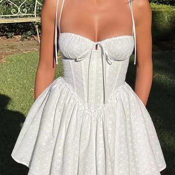 Fleepmart Summer dress 2025 Women Sexy White Lace Dressses Embroideryed Bodycon Mini Dress Korean Fashion Ruffle Dresss Lace Up Fish Bone