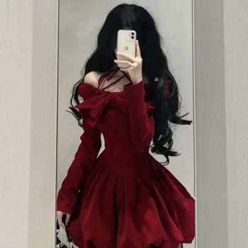Fleepmart Vintage Bow Mini Dress Women Y2K Sexy Slash Neck Red Velvet Dresses Winter Kawaii Christmas Party Bodycon A Line Vestidos
