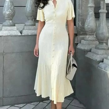 Fleepmart Elegant Knitted Dress Women Solid Single Breasted O Neck Short Sleeve High Waist Hip Package Dresses 2025 Autumn Chic Robes Lady