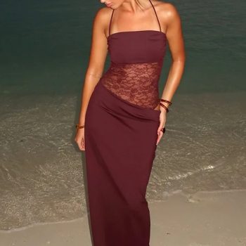 Fleepmart Elegant Lace Cut Out Maxi Dresses for Women 2025 Sexy Spaghetti Strap Patchwork Holidays Party Dress Summer Backless Long Dress