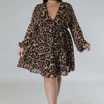 Fleepmart Plus Size Clothing Women Fall Youth Casual 3xl 4xl Long Sleeve Short Leopard Printed Dress Sexy Wear