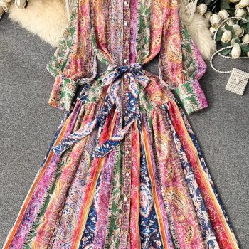 Fleepmart Spring Holiday Paisley Maxi Dress Women Clothing Turleneck Long Lantern Sleeve Flower Retro Print Belted Chiffon Loose Vestidos