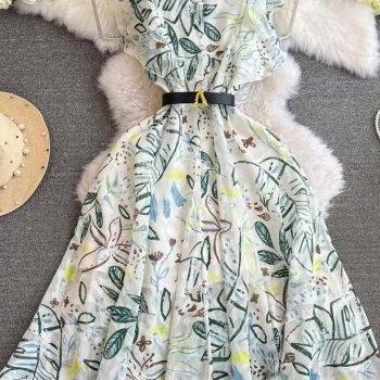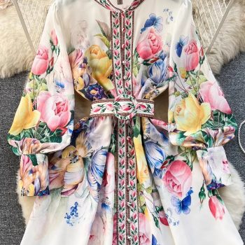 Fleepmart New Spring Summer Vintage Stand Collar Long Lantern Sleeve Chiffon Dress Women’s Flower Print Belt Loose A Line Maxi Vestidos