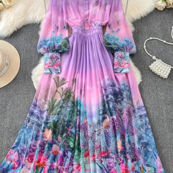 Fleepmart Fashion Spring Summer Beach Flower Chiffon Dress Women’s Long Lantern Sleeve Purple Flower Print Boho Long Robe Vestidos