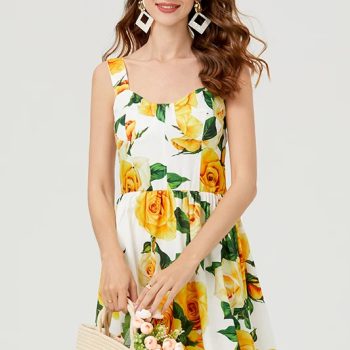 Fleepmart summer Holiday Flower Mini Dress for Women Spaghetti Strap V-Neck Backless High Waist Floral Print Beach Short Vestidos 634