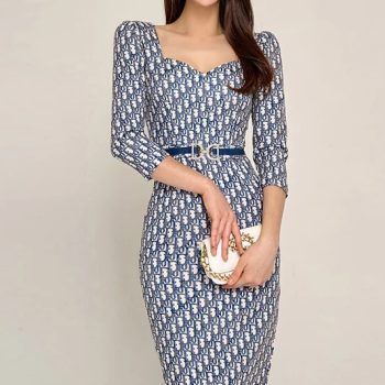 Fleepmart Elegant Formal Dress Vintag Print Square Collar Belt Pencil Dress 2023 Fashion Spring Autumn Slim Bodycon Office Lady Dress