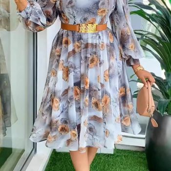 Fleepmart Women Printed A Line Dress Long Lantern Sleeves Cut Out Chest Female Modest Gowns Elegant Office Ladies Classy Gowns Spring New