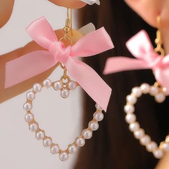 Fleepmart Fashion Sweet Love Heart Bowknot Pendant Hoop Earrings Harajuku Y2k Ribbon Bow Pearl Earings For Women Jewelry