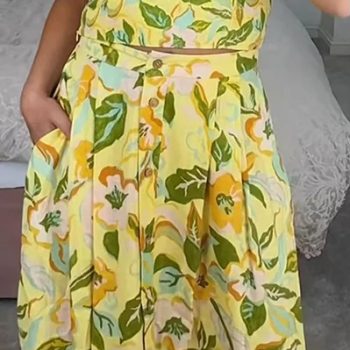 Fleepmart Women Floral Print Skirt Two Piece Set Sexy Crop Sling Camisole Casual Beach Holiday Style A-line Skirts Sets Female New