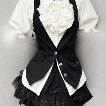 Fleepmart Gothic Retro Chic Outfit Women Bubble Sleeve Shirt + Slim Vest + Short Cake Skirt New Vintage Fashion 3 Piece Suit 2025